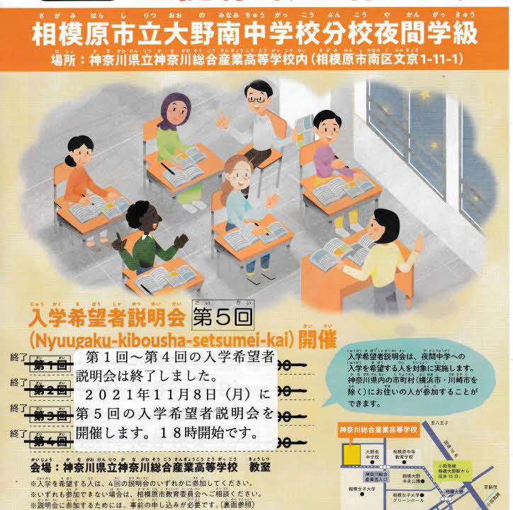 相模原市の夜間中学の説明会【第5回・最終回】のご案内(11月8日18時~)